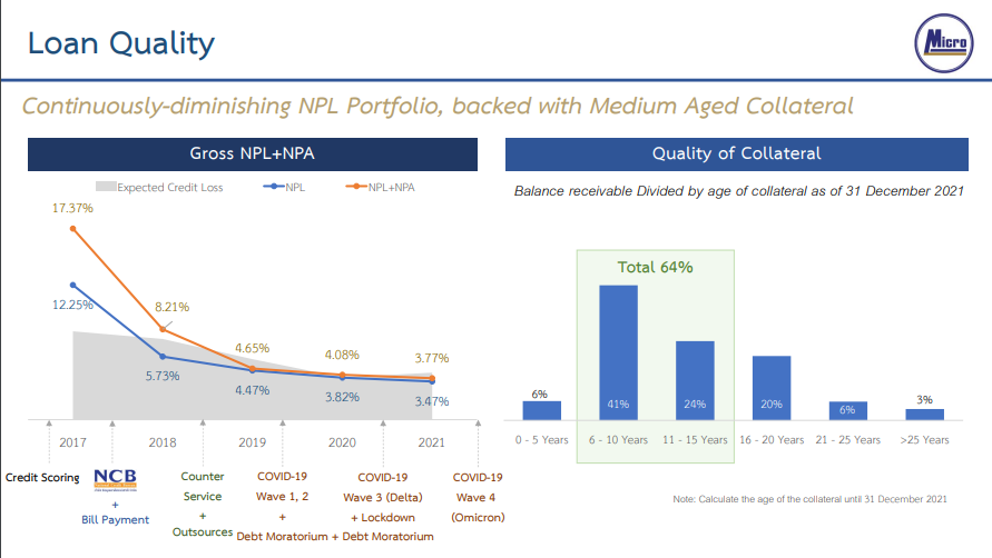 – Credit cost 4.9% สูงขึ้นเยอะปีก่อน 3.4% จากกฎกระทรวงมาตรา 374 ทำให้บริษัท Write off หนี้สูญเร็วขึ้น อีกส่วนหนึ่งคือหนี้สูญรับคืนกลับมาช้ากว่าปกติเพราะติดโควิด ปีนี้น่าจะดีขึ้น